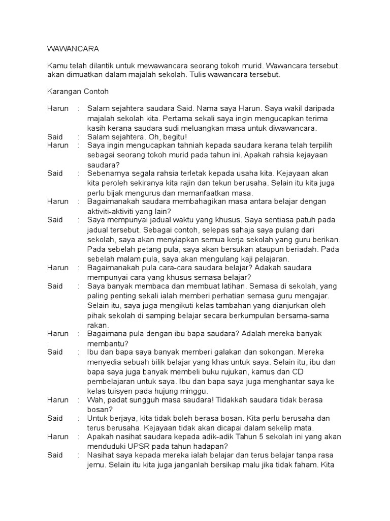 Andaikan anda seorang pemberita. Check more flip ebooks related to Contoh Karangan of g-38425820. Wawancara dan temu ramah lebih kepada perbualan rasmi pertanyaan kepada orang yang lebih dihormati atau ingin tahu sesuatu perkara.
